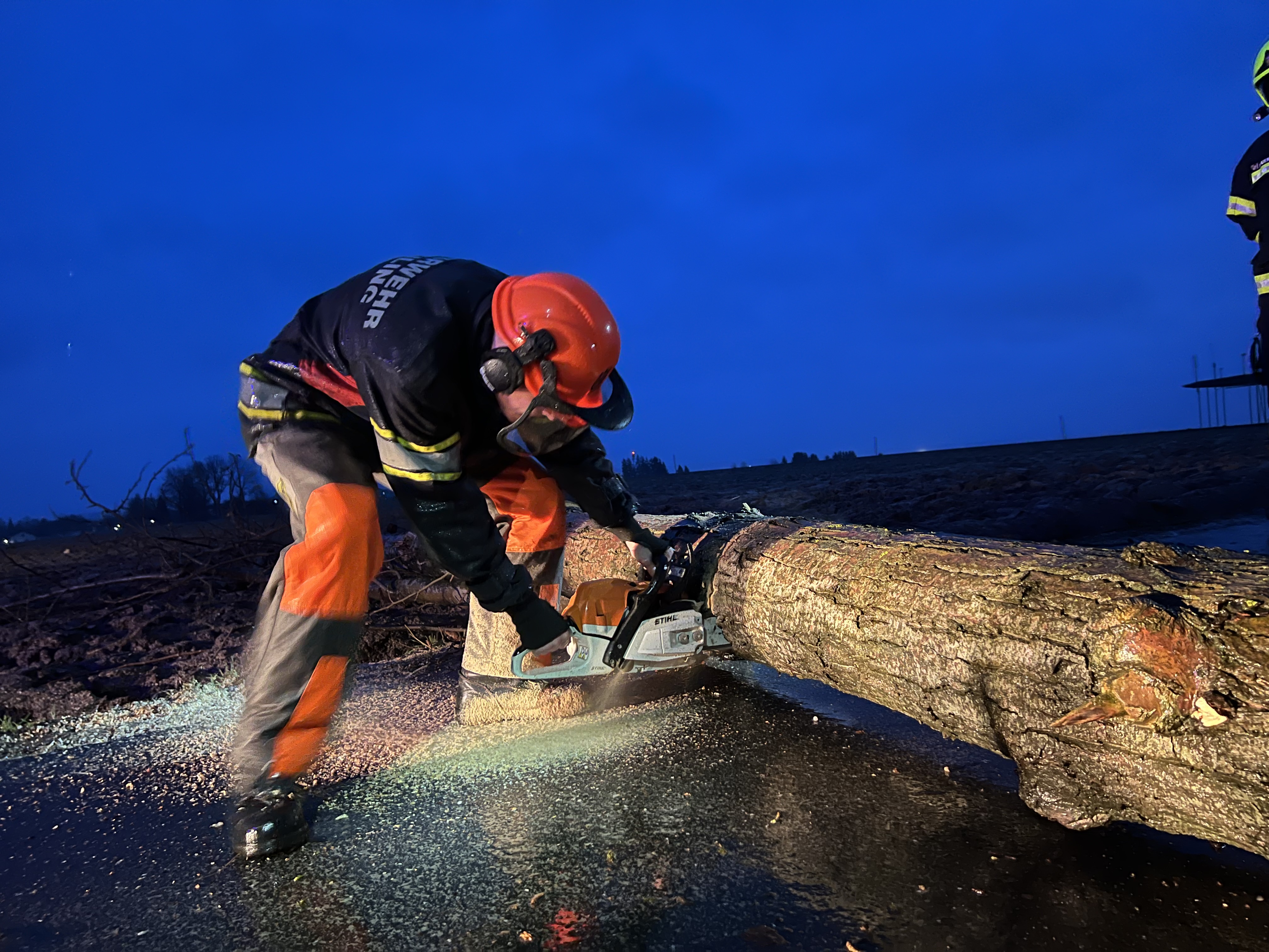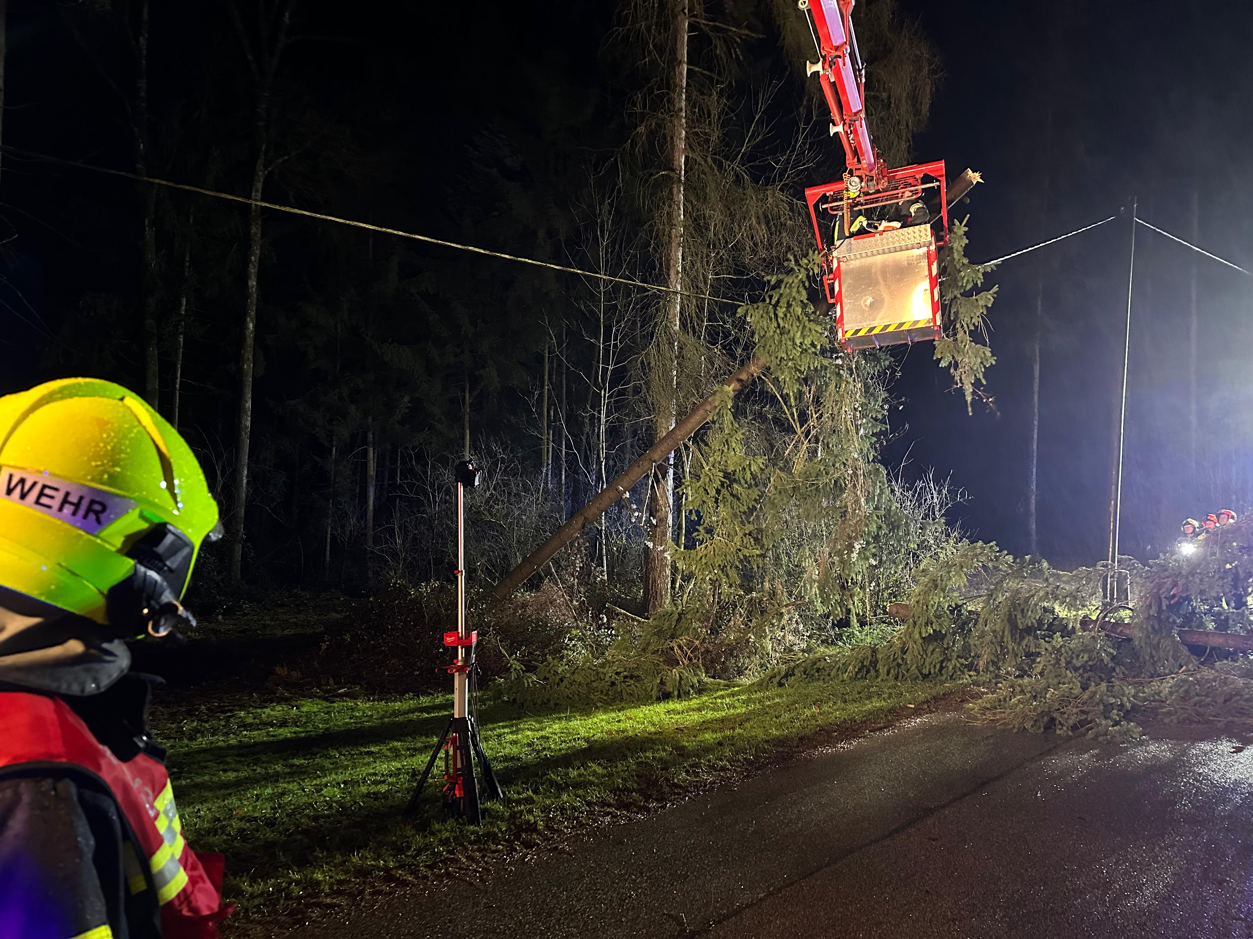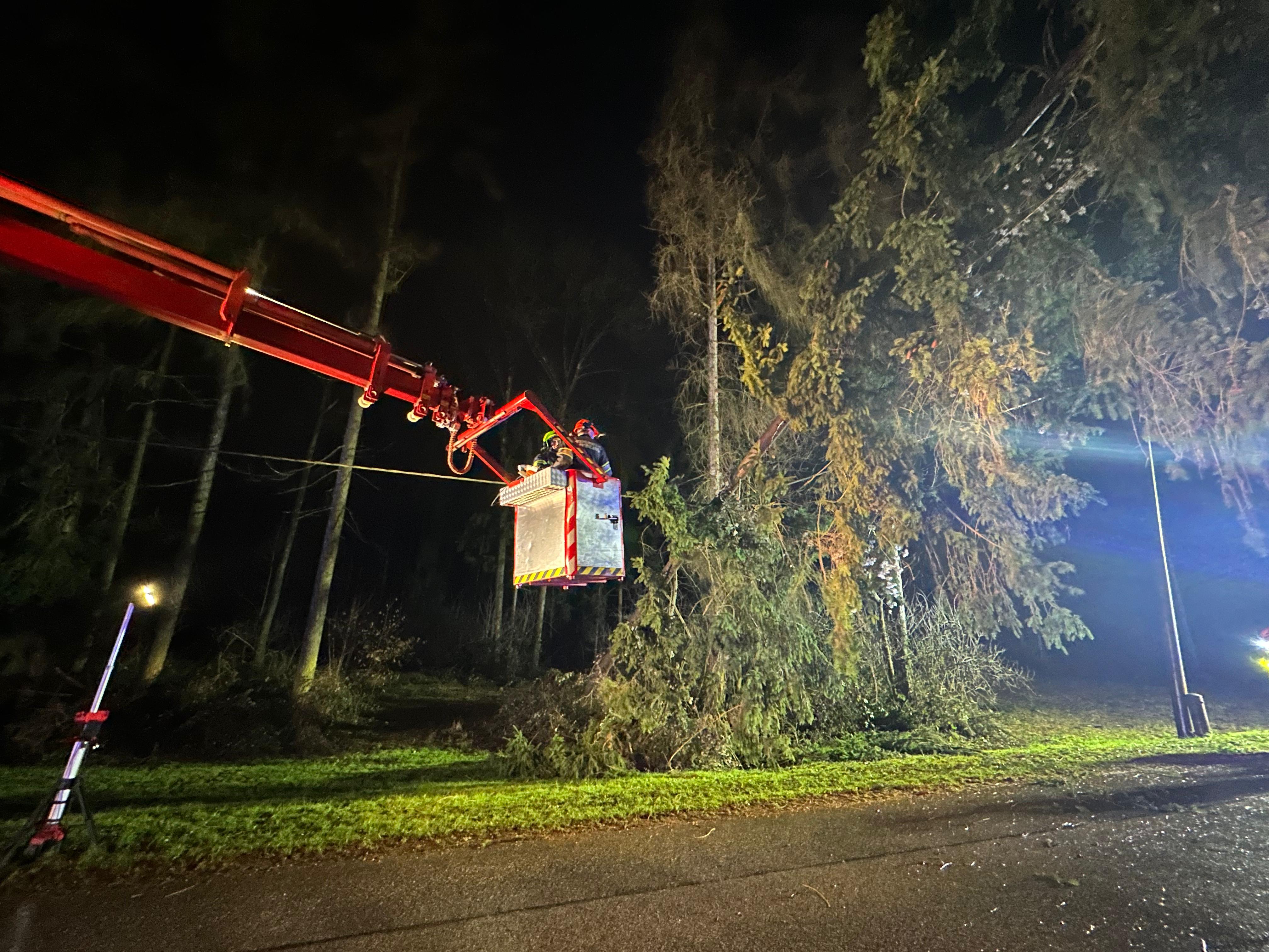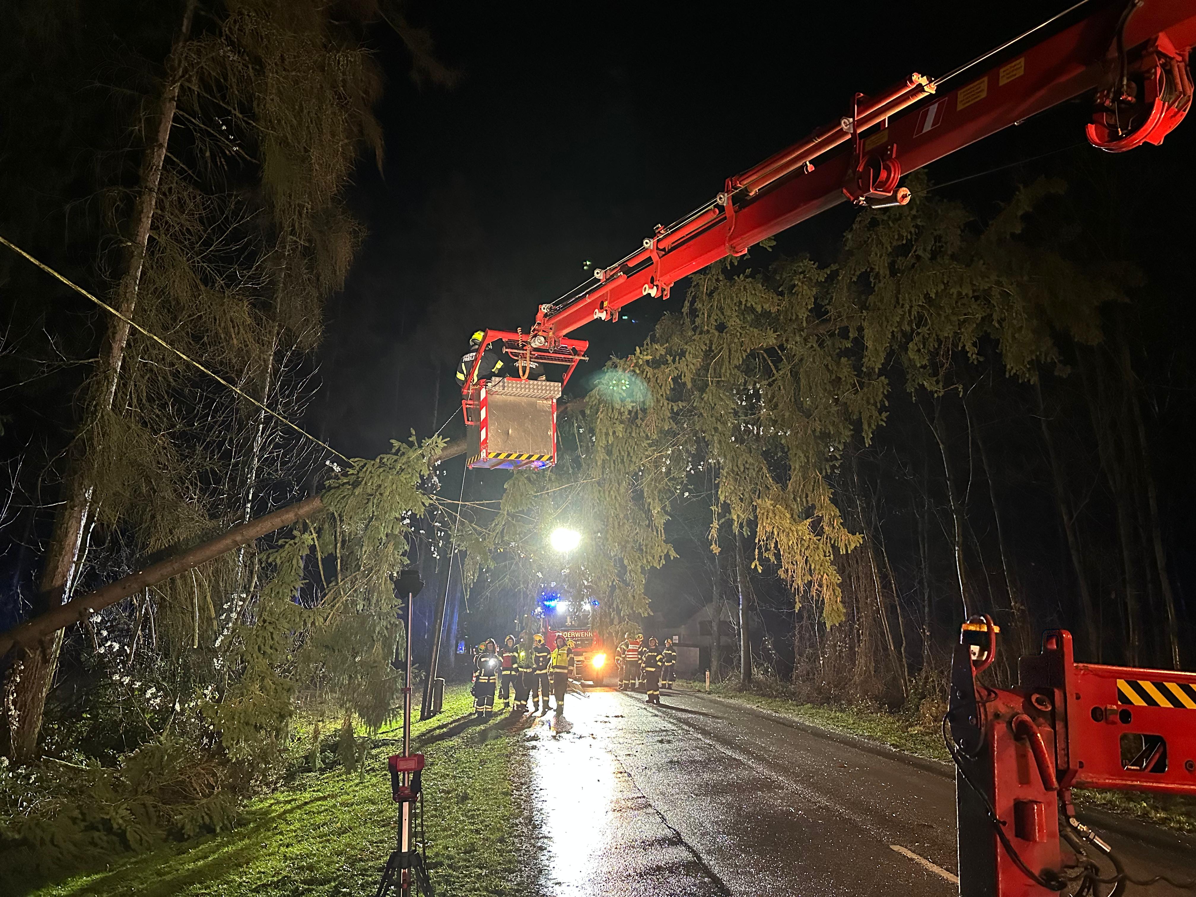Der erste wetterbedingte Einsatz wurde dann um 21:55 Uhr alarmiert: ein Baum war in eine Stromleitung gestürzt. Mittels Kran Freiling konnte man problemlos einen entsprechend ausgerüsteten Mann mit Kettensäge in die Höhe befördern und den Baum mit zwei Schnitten von der Stromleitung entfernen.